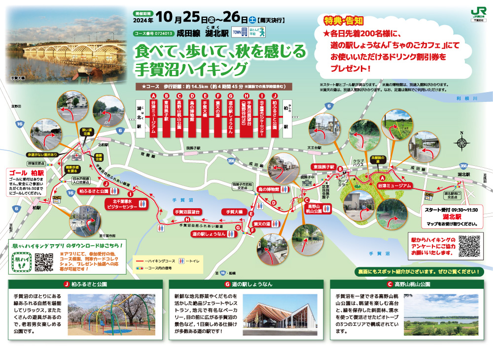 湖北駅→谷津ミュージアム→東我孫子駅→高野山桃山公園→鳥の博物館→手賀大橋→満天の湯→道の駅しょうなん→手賀沼展望台(鷺野谷付近)→北千葉導水ビジターセンター→柏ふるさと公園→柏駅